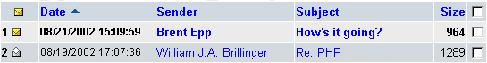 La première colonne représente l' Etat du message. L'enveloppe jaune fermée, indique que le message n'a pas encore été lu. Notez que tout le texte de cette ligne (du premier message) est affichée en gras. L'enveloppe du second message de l'exemple (deuxième ligne) est blanche et ouverte. Cela signifie que le message correspondant a été lu. Prenez note que le texte de la deuxième ligne de message est affiché en police normale (non grasse). Vous pouvez changer l'état du message en cliquant sur l'enveloppe située à coté du message. Si l'état est Lu, il sera changé en Non lu, et vice-versa.