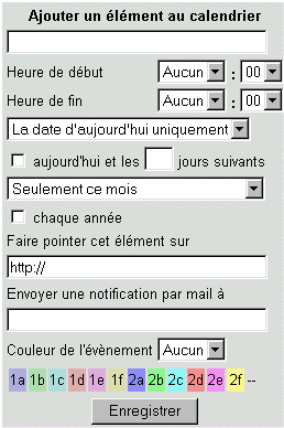 Pour ajouter une entrée, frappez au clavier votre mémo dans le champ texte situé sous Ajouter un élément au calendrier. Vous devrez sélectionner les heures auxquelles doit avoir lieu l'évènement. A coté de Heure de début, sélectionnez l'heure et les minutes de l'heure du jour souhaitée. Vous pouvez également sélectionner une Heure de fin pour cet évènement (la saisie est identique à celle de l'Heure de début). Si vous sélectionnez la valeur "Aucun" pour l'Heure de début, l'évènement sera ajouté en fin de la liste des évènements pour ce jour, sans heure particulière. Vous pouvez utiliser cette possibilité lorsque par exemple, vous connaissez la date ou le jour de l'évènement, sans autre précision quant à l'heure exacte de celui-ci. Si vous ne sélectionnez aucune Heure de fin, l'évènement n'indiquera pas d'heure de fin.